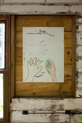 Ultimately Acacia began to utilize codified and illusionistic formal strategies interchangeably with automatism. Scribbled pastel skies are two lumpy figures embracing. Stick figures hold hands. An effortful line shades the shape of a plant. Hands, the nexus of touch, are holding, waving, fisting, rubbing, offering the peace sign. Bodies are indistinguishable from the land—cartoon undulating mountains are a myriad of orifices who confuse insides from out. There are traces of whimsy, indecision, confidence, fatigue, anger, and joy.